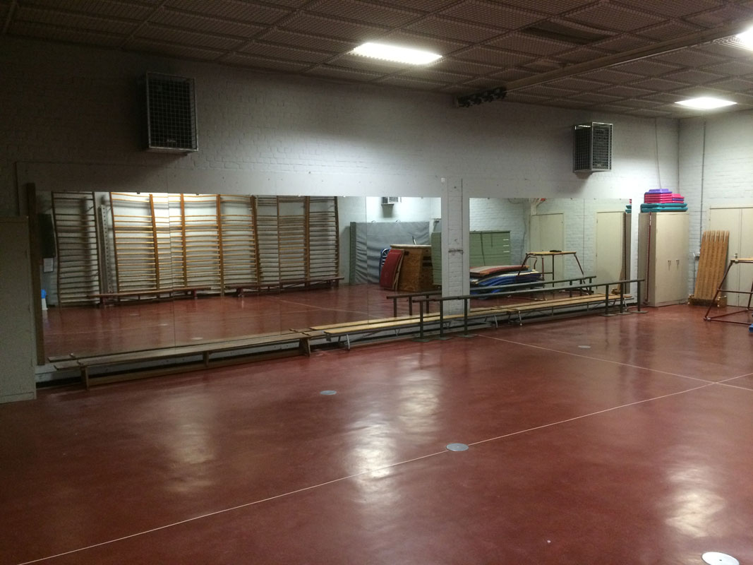 De turnzaal heeft een oppervlakte van 110m² en kan perfect gebruikt worden voor danslessen, yoga...